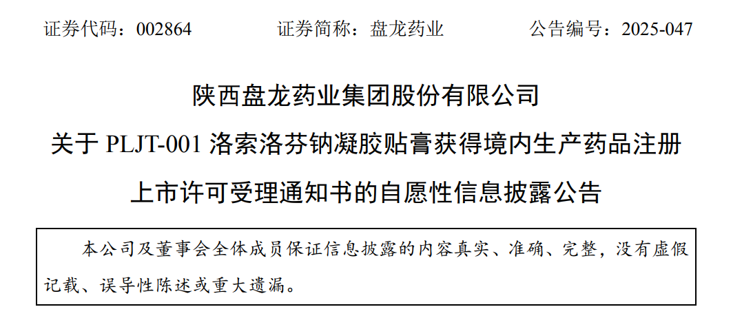 近日,陕西盘龙药业(002864)集团股份有限公司(股票代码:002864)发布自愿性信息披露公告,其在研产品洛索洛芬钠凝胶贴膏(PLJT-001) 正式收到国家药品监督管理局下发的仿制药上市许可申请《受理通知书》(受理号:CYHS2503515)。这一里程碑标志着这款外用制剂,已顺利进入国家药监局药品审评中心的审评审批流程,盘龙药业在抗炎镇痛细分领域的研发进程实现关键突破。