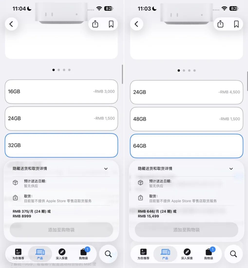 具体表现为,在选购 Mac mini 32GB 和 64GB 版本时,会显示暂无供应状态,不管是送货或者是零售店取货都无法进行选择。