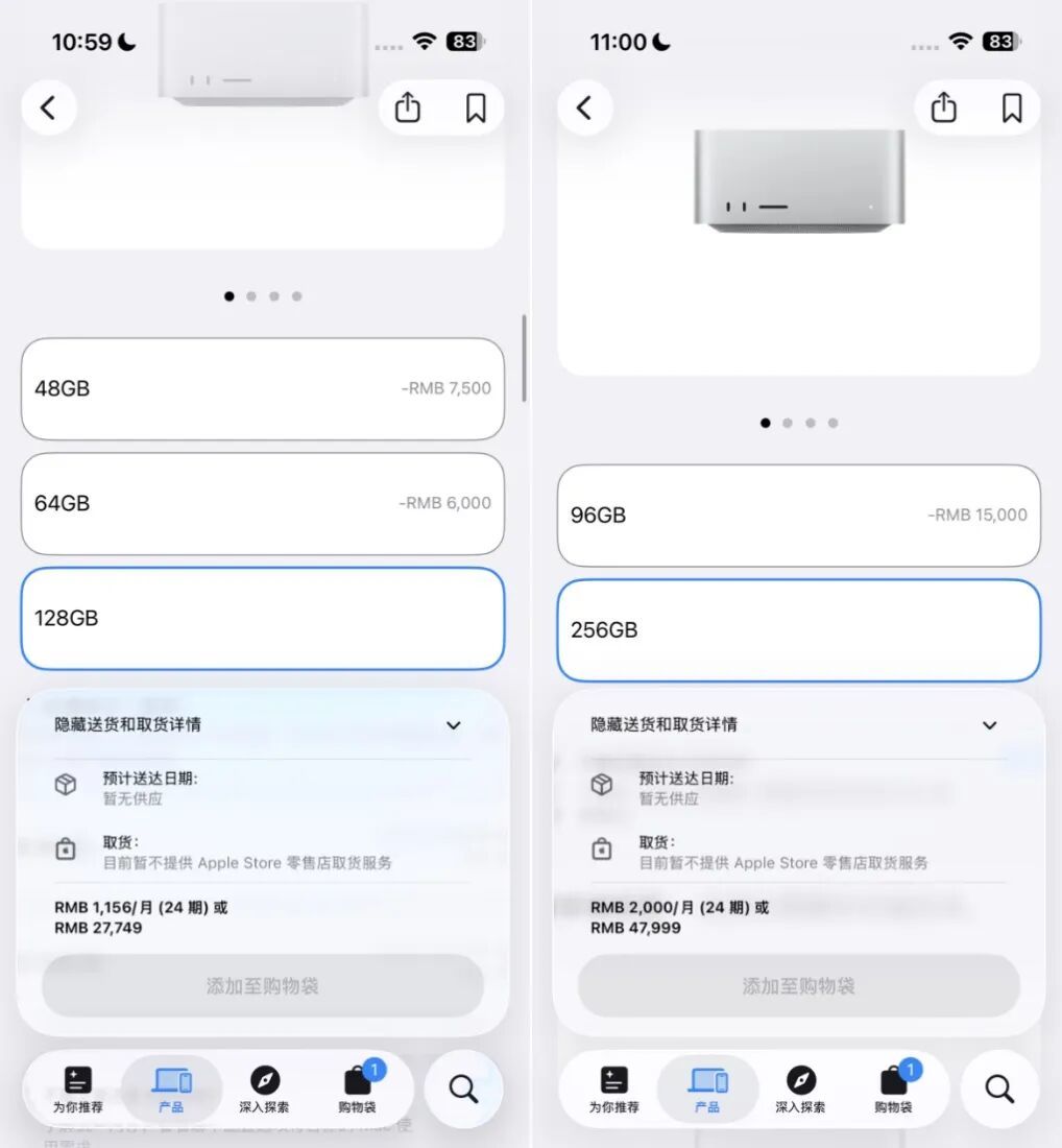 在选购 Mac Studio 的 128GB 和 256GB 内存版本时,也会显示暂无供应,不管是送货还是零售店取货都无法选择。