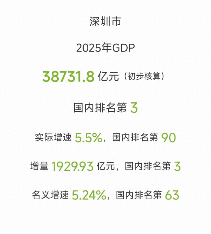 2025年深圳经济“成绩单”正式出炉,全市地区生产总值达38731.80亿元,同比增长5.5%,增速高于全国平均水平。这一亮眼表现与广东省整体3.9%的增长率形成鲜明对比,深圳作为经济引擎的作用愈发凸显。