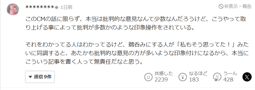 不管男女,批判的激烈程度是否一样呢?广告(CM)本身就有“只要吸引眼球就好”的意图。