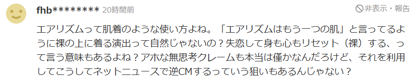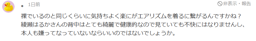 其实这已经不是绫濑遥第一次半裸为Airism系列拍摄广告了,早在去年绫濑遥为该系列拍摄的广告就频繁出现她仅穿内衣背心,甚至上半身裸露的画面。当时过于大胆的裸露尺度确实让许多人感到困惑,导致质疑声不断。