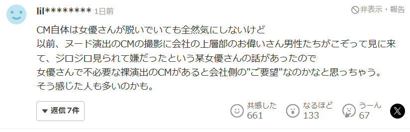 其实对于广告(CM)本身,即使女演员有裸露镜头,我也完全不在意。